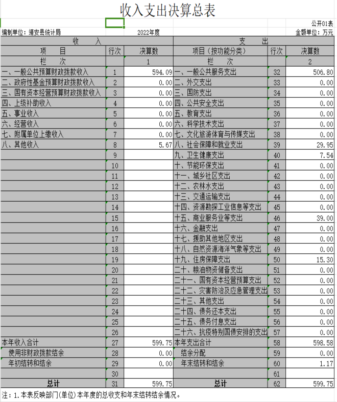 本部門2022年度收入總計599.75萬元,其中年初結轉和結余0萬元,較2021年增加90.06萬元,增長17.7%;本年收入合計 599.75萬元,較2021年增加90.06萬元,增長17.7%,主要原因是:根據靖府發〔2021〕2號文件精神,增加了鼓勵企業和項目入庫獎勵金。