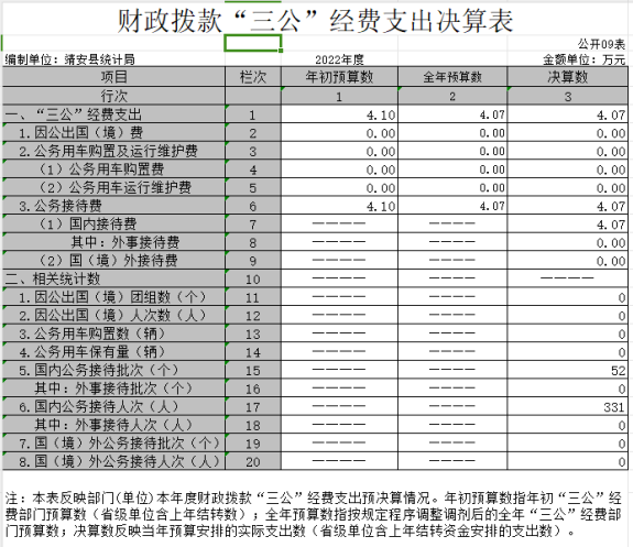 “三公”經費支出:指用財政撥款安排的因公出國(境)費、公務用車購置及運行維護費和公務接待費。其中,因公出國(境)費反映單位公務出國(境)的國際旅費、國外城市間交通費、住宿費、伙食費、培訓費、公雜費等支出;公務用車購置及運行維護費反映單位公務用車車輛購置支出(含車輛購置稅、牌照費),按規定保留的公務用車燃料費、維修費、過橋過路費、保險費、安全獎勵費用等支出;公務接待費反映單位按規定開支的各類公務接待(含外賓接待)支出。