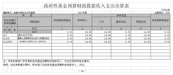 (四)城鄉社區支出年初預算數為0萬元,決算數為14.8萬元,完成年初預算的1480%,主要原因是:財政安排從國土收入中撥付靖安縣農村生活污水治理專項規劃編制費用。