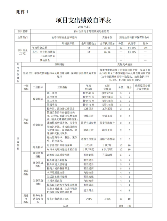 我部門今年在部門決算中反映“農村生活污水處理設施運維經費”項目績效評價情況,詳見附件。
