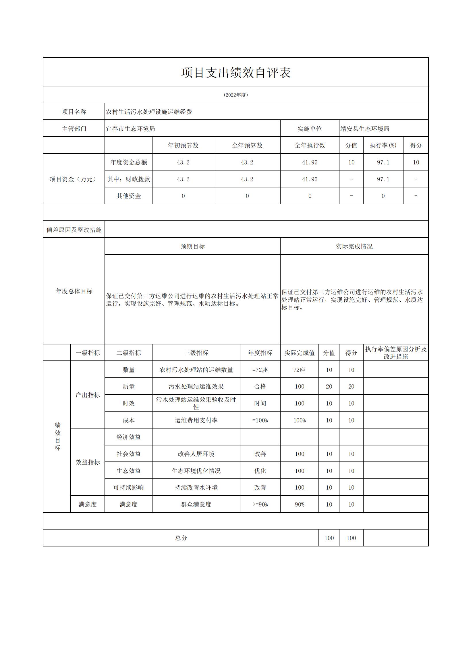“農村生活污水處理設施運維經費”項目績效自評得分為100分。“項目全年預算數為43.2萬元,執行數為41.95萬元,完成預算的97.1%。項目績效目標完成情況:完成2022年度我縣鎮村污水處理設施運維,保障污水處理設施正常運行.每季度根據運維公司實際接管個數,完成了我縣2022年4個季度鎮村污水處理設施運維工作(由于按照具體接管個數付款,故資金執行率97.1%,但項目執行率100%)。