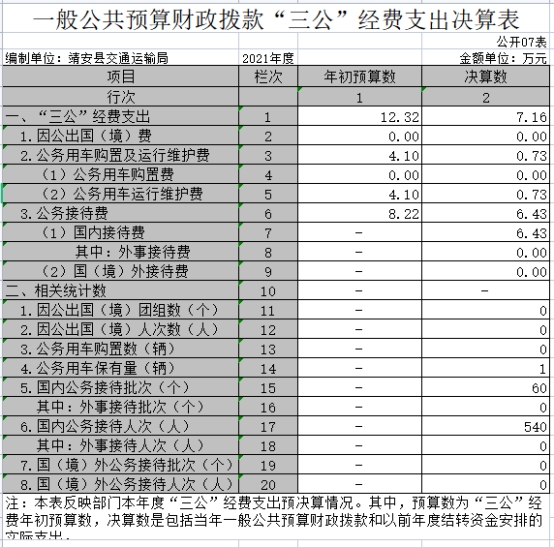 (十七)“三公”經(jīng)費(fèi)支出:指用一般公共預(yù)算財(cái)政撥款安排的因公出國(境)費(fèi)、公務(wù)用車購置及運(yùn)行維護(hù)費(fèi)和公務(wù)接待費(fèi)。其中,因公出國(境)費(fèi)反映單位公務(wù)出國(境)的國際旅費(fèi)、國外城市間交通費(fèi)、住宿費(fèi)、伙食費(fèi)、培訓(xùn)費(fèi)、公雜費(fèi)等支出;公務(wù)用車購置及運(yùn)行維護(hù)費(fèi)反映單位公務(wù)用車車輛購置支出(含車輛購置稅、牌照費(fèi)),按規(guī)定保留的公務(wù)用車燃料費(fèi)、維修費(fèi)、過橋過路費(fèi)、保險(xiǎn)費(fèi)、安全獎(jiǎng)勵(lì)費(fèi)用等支出;公務(wù)接待費(fèi)反映單位按規(guī)定開支的各類公務(wù)接待(含外賓接待)支出。