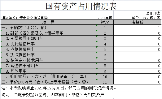 截止2021年12月31日,本部門(單位)國有資產(chǎn)占用情況見公開10表《國有資產(chǎn)占用情況表》。本部門保有1輛公路執(zhí)法車輛。