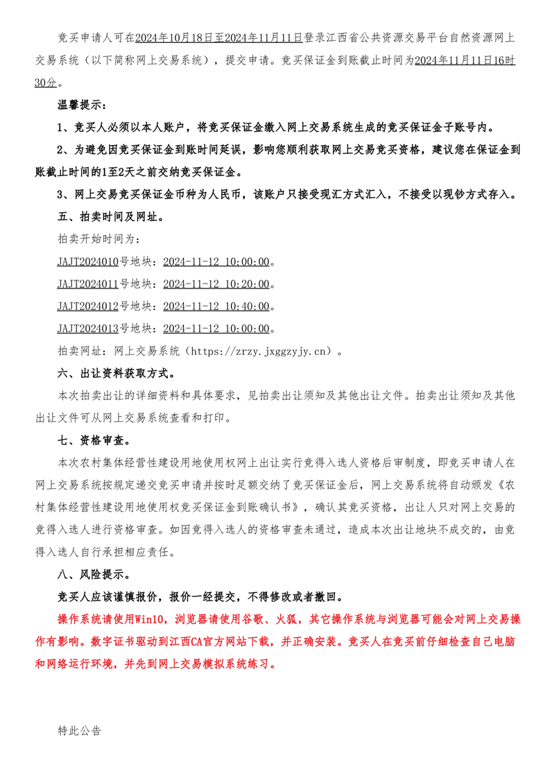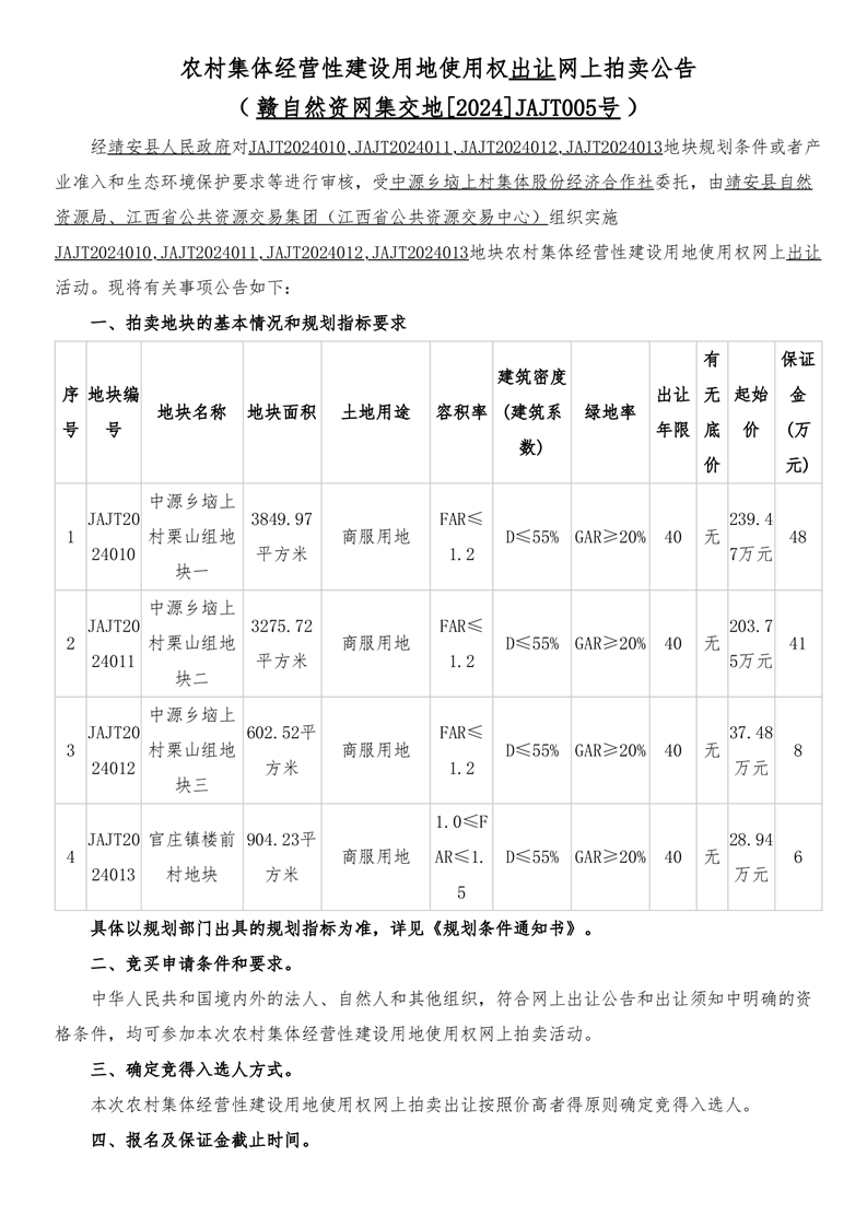 農村集體經營性建設用地使用權出讓網上拍賣公告( 贛自然資網集交地[2024]JAJT005號 )