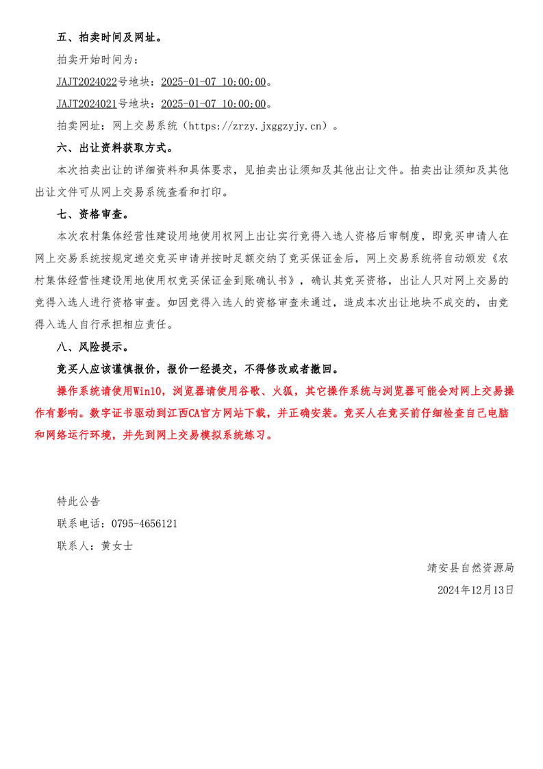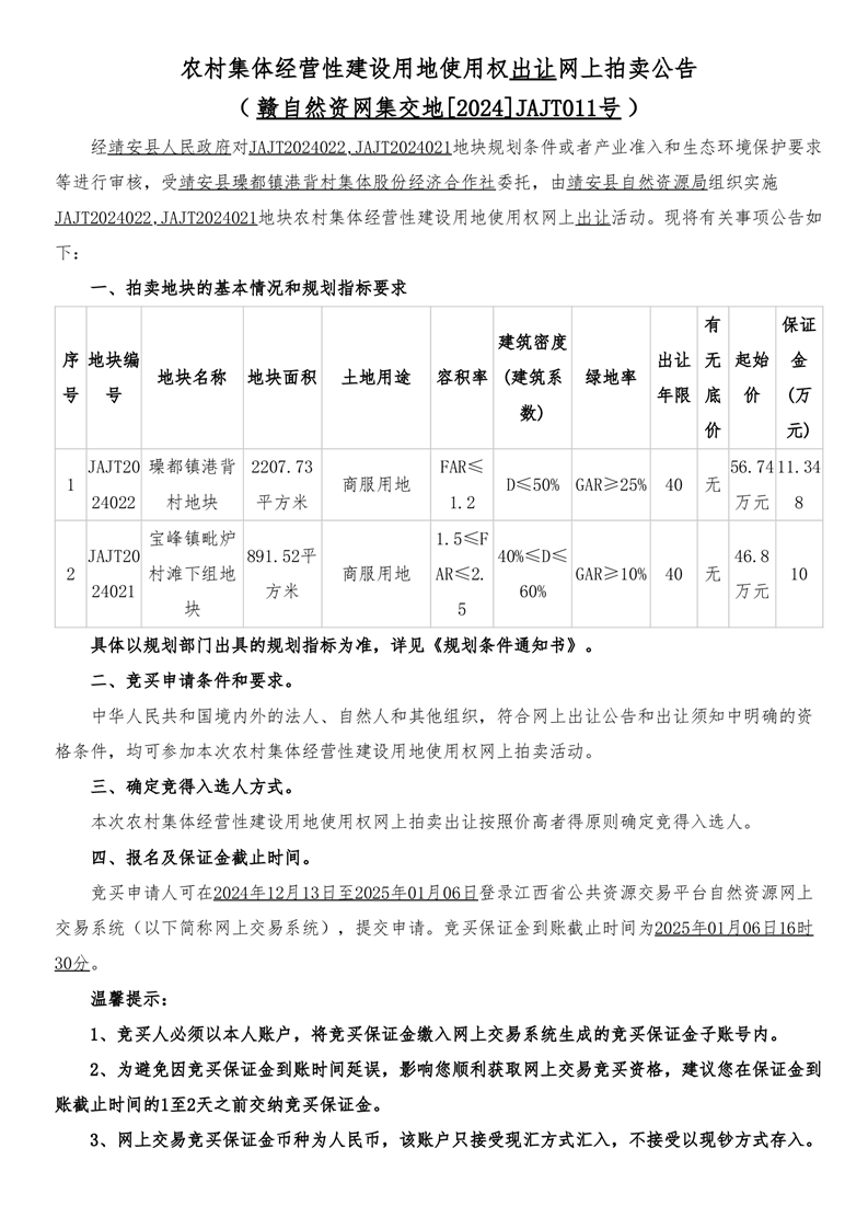 農村集體經營性建設用地使用權出讓網上拍賣公告( 贛自然資網集交地[2024]JAJT011號 )