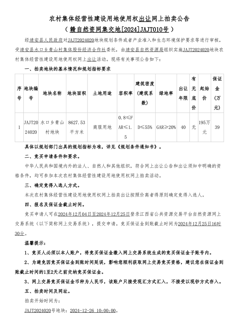 農村集體經營性建設用地使用權出讓網上拍賣公告( 贛自然資網集交地[2024]JAJT010號 )