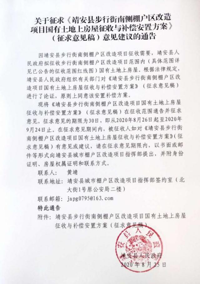 現將《靖安縣步行街南側棚戶區改造項目國有土地上房屋征收與補償安置方案》(征求意見稿)在征收范圍通告并征求意見,征求意見的期限為30日,即從2020年8月26日起至2020年9月24日止。在征求意見期間內,被征收人如對《靖安縣步行街南側棚戶區改造項目國有土地上房屋征收與補償安置方案》(征求意見稿)有意見或建議,請在征求意見期限內,以書面或郵件等形式向靖安縣城市棚戶區改造項目指揮部提出,并附身份證明、房屋權屬證明和聯系方式。