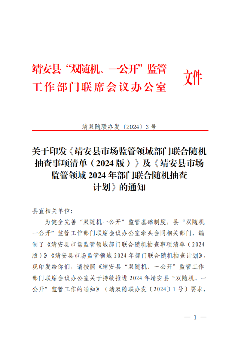 關于印發《靖安縣市場監管領域部門聯合隨機抽查事項清單(2024版)》《靖安縣市場監管領域2024年部門聯合隨機抽查計劃》的通知