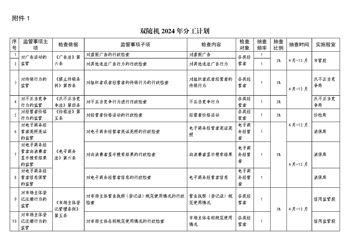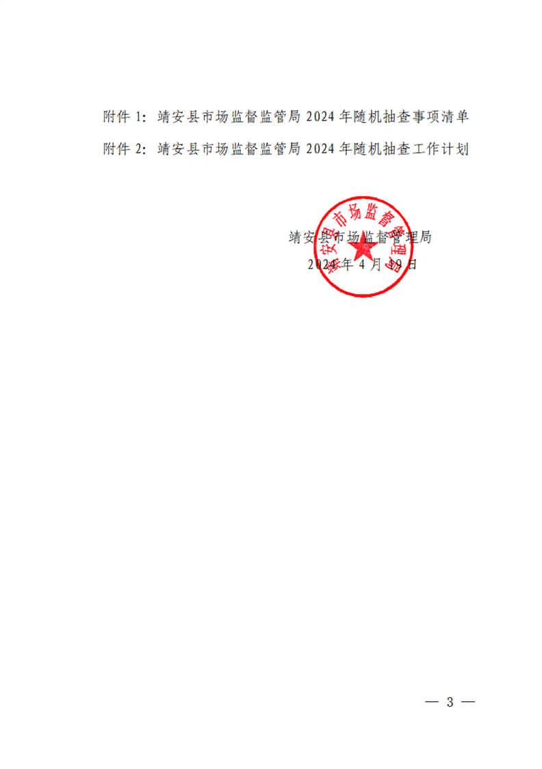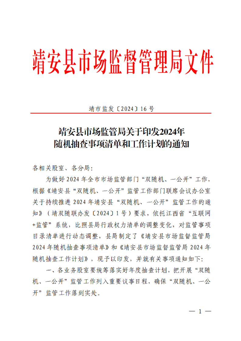 靖安縣市場監管局關于印發2024年隨機抽查事項清單和工作計劃的通知