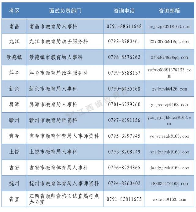 (四)考生如有相關問題,可關注“教育部中小學教師資格考試網”(http://ntce.neea.edu.cn)或“江西教育網”(http://jyt.jiangxi.gov.cn),了解中小學教師資格面試的相關信息,也可以電話咨詢相應的考區,各考區聯系電話見下圖。