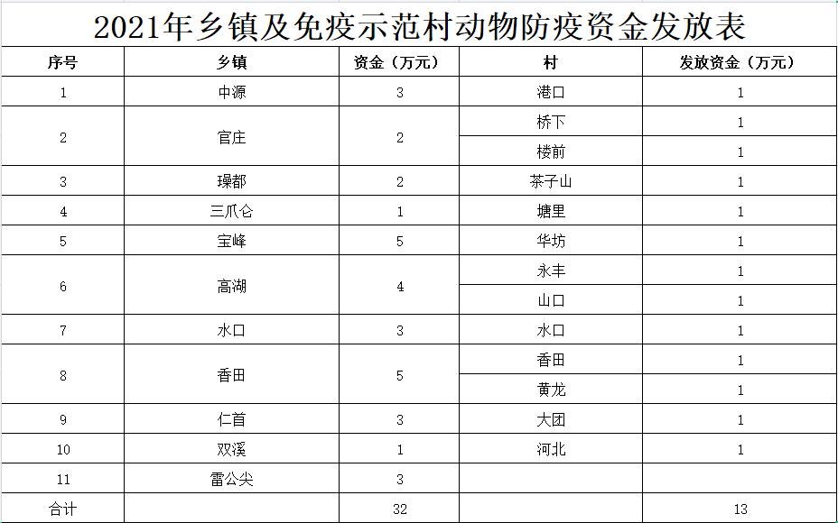 2021年鄉(xiāng)鎮(zhèn)及免疫示范村動物防疫資金發(fā)放表