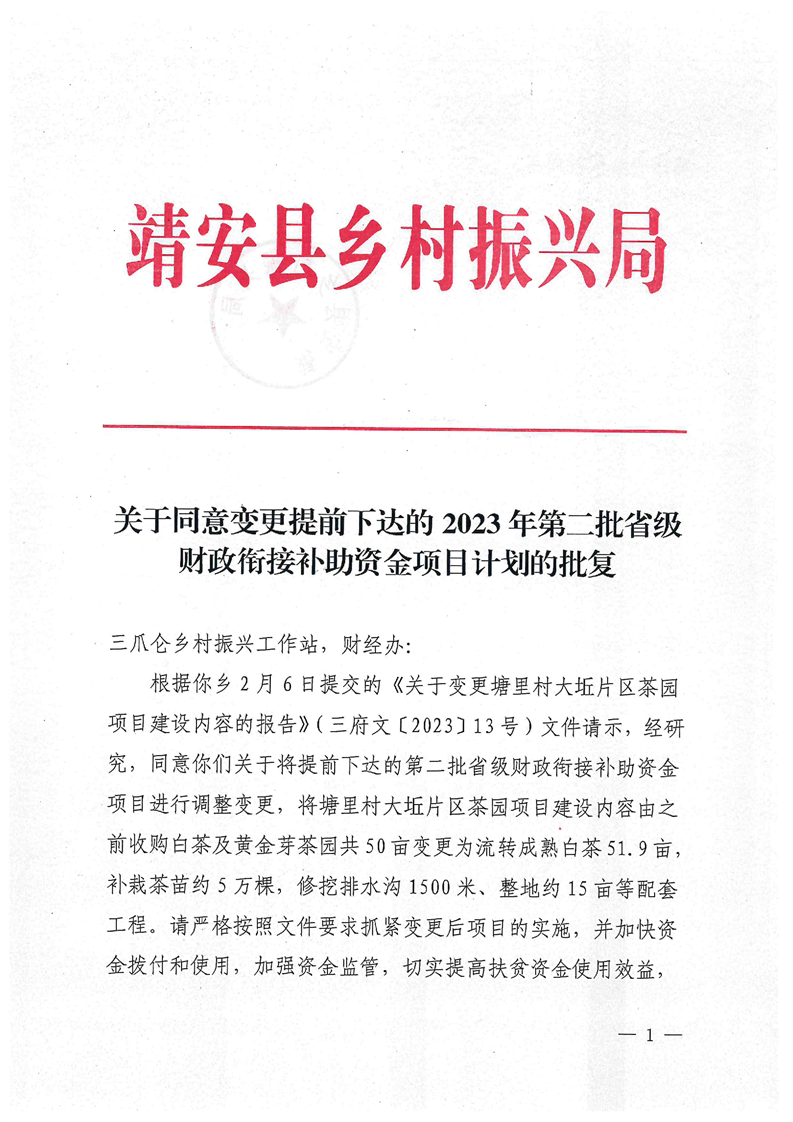 關于同意變更提前下達的2023年第二批省級財政銜接補助資金項目計劃的批復