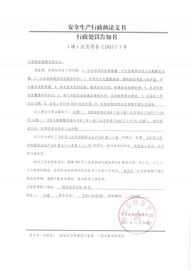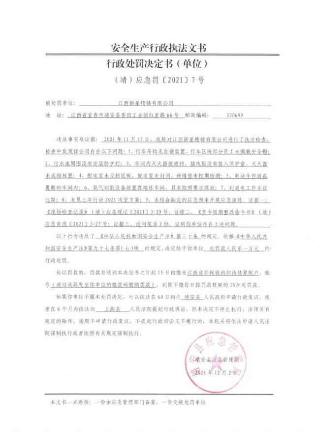 江西新星精鑄有限公司違反了《中華人民共和國安全生產法》第二十七條第一款的規(guī)定,依據《中華人民共和國安全生產法》第九十四條第(七)項的規(guī)定,責令其限期改正,處人民幣一萬元罰款的行政處罰。 2021年12月3日,該企業(yè)已向指定賬戶繳納了罰款人民幣一萬元。
