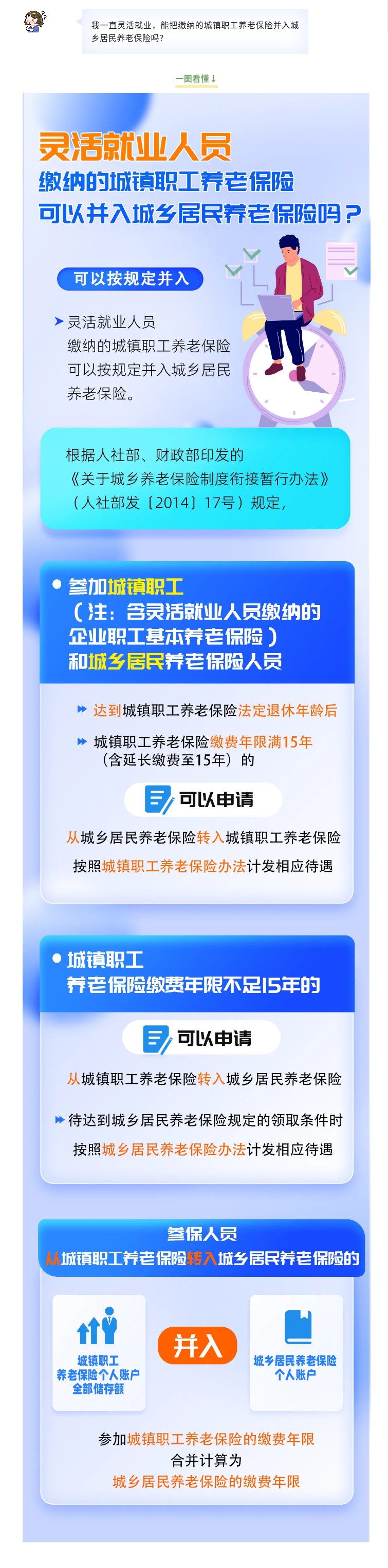 【一圖看懂】靈活就業人員繳納的城鎮職工養老保險能并入城鄉居民養老保險嗎?