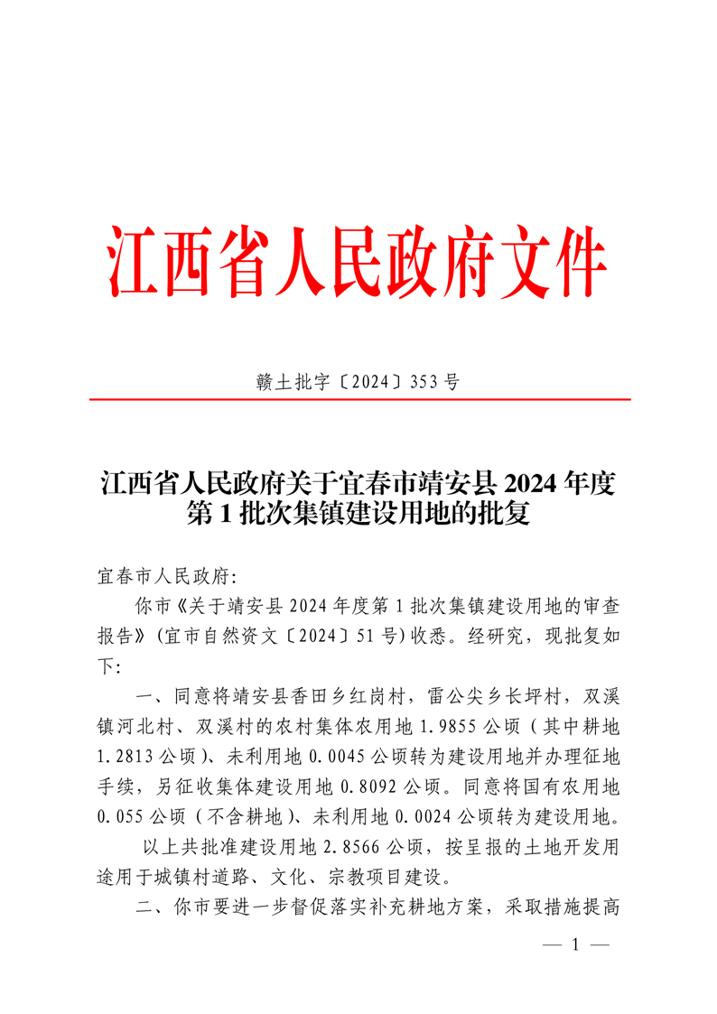 關(guān)于靖安縣2024年度第1批次集鎮(zhèn)建設(shè)用地的批復(fù)