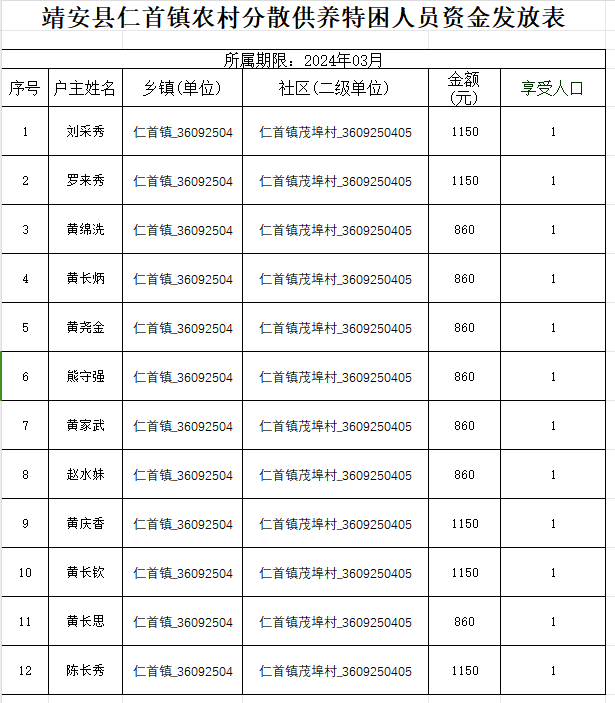 仁首鎮茂埠村2024年3月農村分散供養特困人員資金發放表