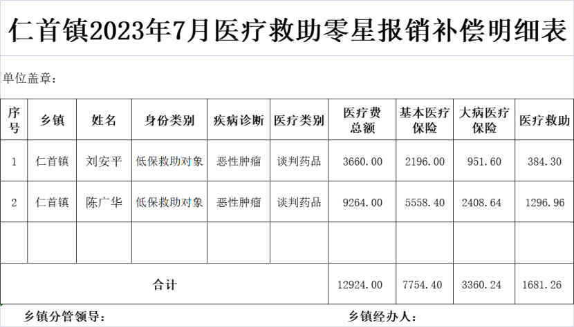 仁首鎮 2023 年7月醫療救助零星報銷補償明細表