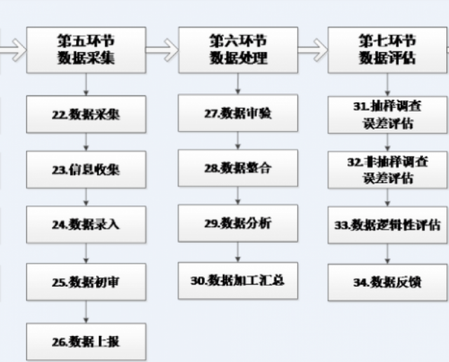 2009年,聯合國歐洲經濟委員會編寫了描述和定義官方統計數據生產業務流程的通用統計業務流程模型(GSBPM)。世界各國基本遵循GSBPM的設計理念建立統計業務流程模型。自2009年起,中國國家統計局參照GSBPM從全系統和全流程的角度對統計業務流程進行再造,推進以企業一套表改革為核心的統計四大工程建設,并于2012年正式實施。為了鞏固提高企業一套表聯網直報改革成果,借鑒GSBPM全流程管理的理念,力求將統計業務流程的規范化要求固化在每一個工作環節中。2013年,充分借鑒國際標準化組織的ISO9000質量管理體系標準、GSBPM,并與我國的統計實際相結合,組織研究制定印發《國家調查隊統計流程規范》,對統計數據生產全過程進行考量和評價,將質量控制擴展到確定需求、統計設計、審批備案、任務部署、數據采集、數據處理、數據評估、數據發布與傳播、統計分析、整理歸檔、綜合評估等11個環節,突出全過程質量控制的理念,進一步加強和改進我國統計質量管理工作。