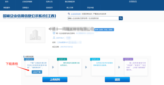 第六步:進入修復界面后,下載“江西省失信記錄市場主體信用修復申請表”、“信用承諾書”,填寫表格內容蓋章交至處罰機關,處罰機關收件并簽署信用修復意見后蓋章。