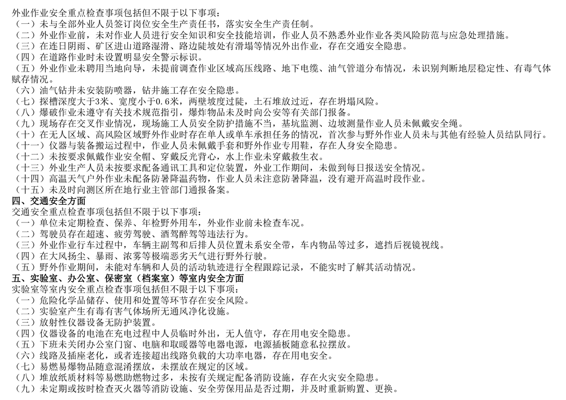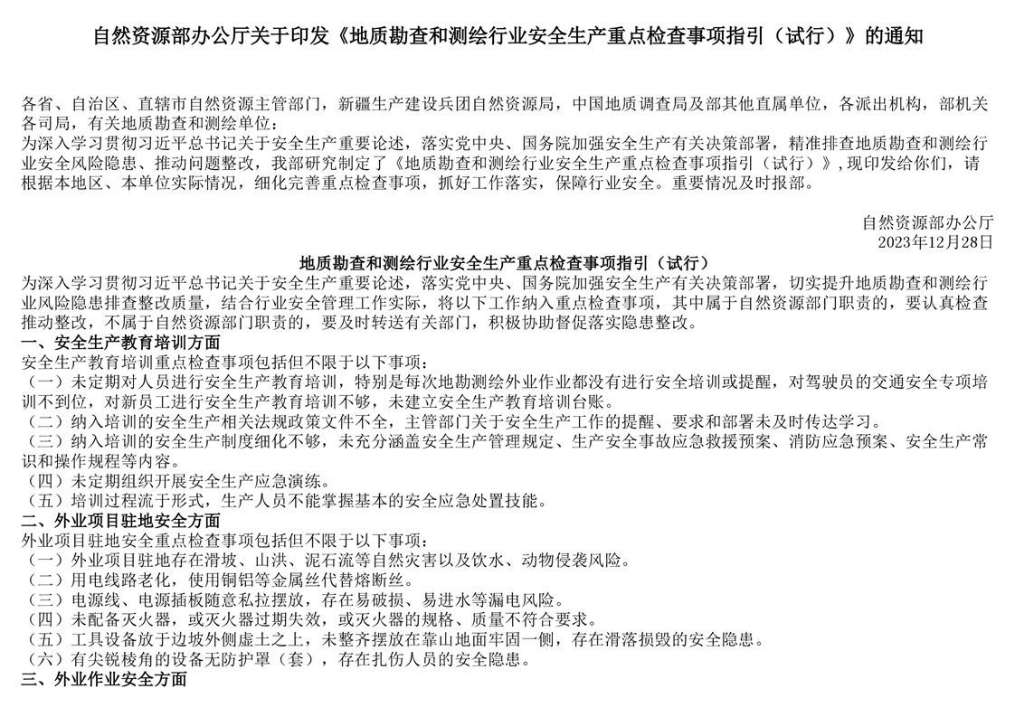 自然資源部辦公廳關(guān)于印發(fā)《地質(zhì)勘查和測繪行業(yè)安全生產(chǎn)重點(diǎn)檢查事項(xiàng)指引(試行)》的通知