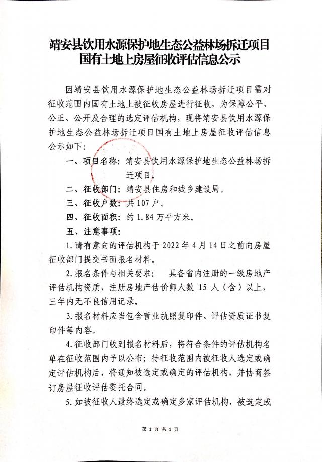 靖安縣飲用水源保護地生態公益林場拆遷項目國有土地上房屋征收評估信息公示