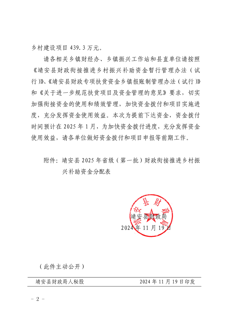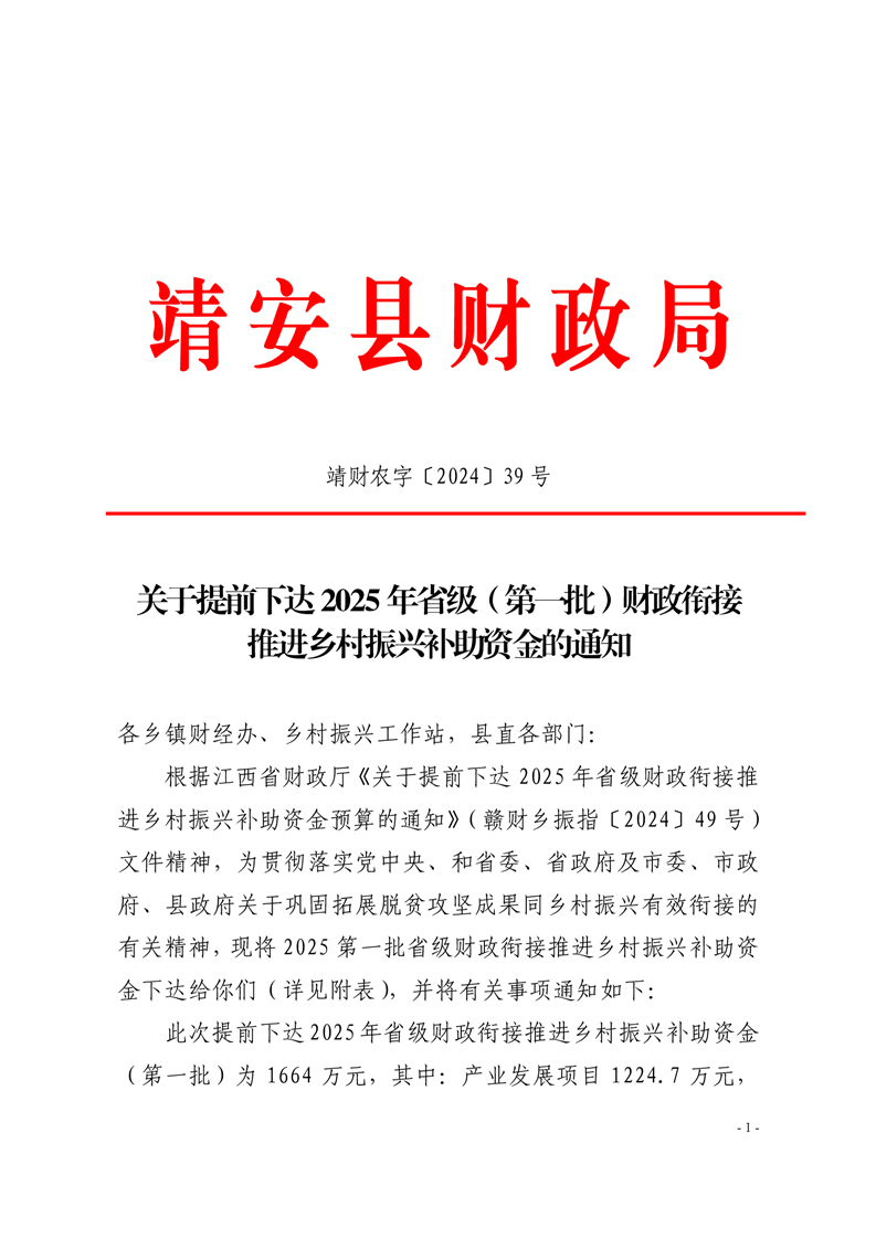 關(guān)于提前下達(dá) 2025年省級(第一批)財政銜接推進(jìn)鄉(xiāng)村振興補(bǔ)助資金的通知