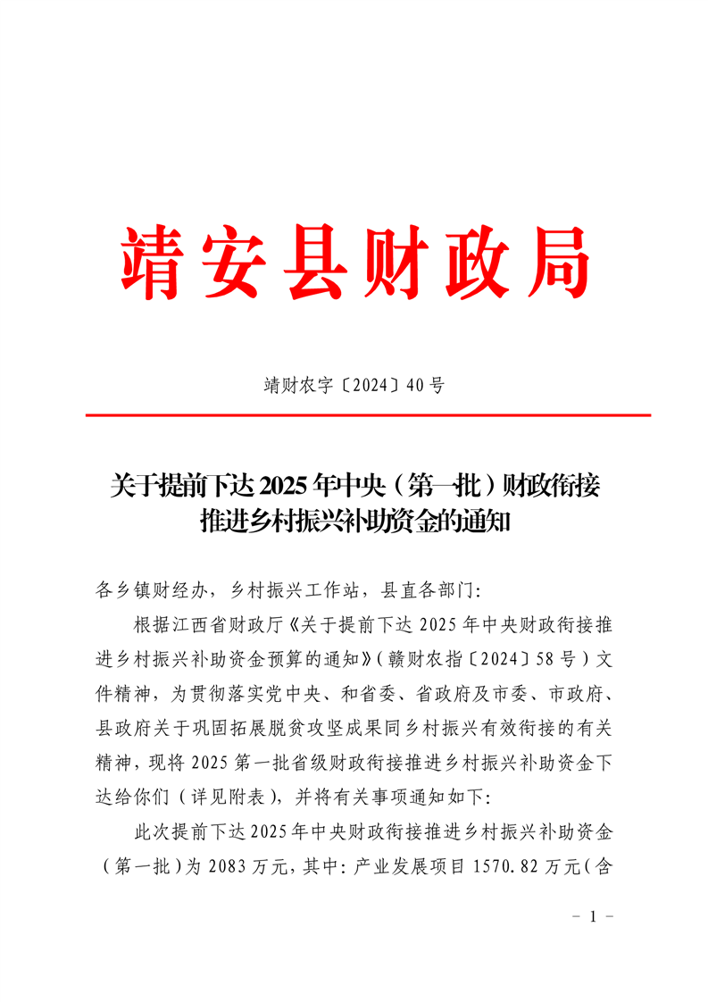 關于提前下達 2025 年中央(第一批)財政銜接推進鄉村振興補助資金的通知